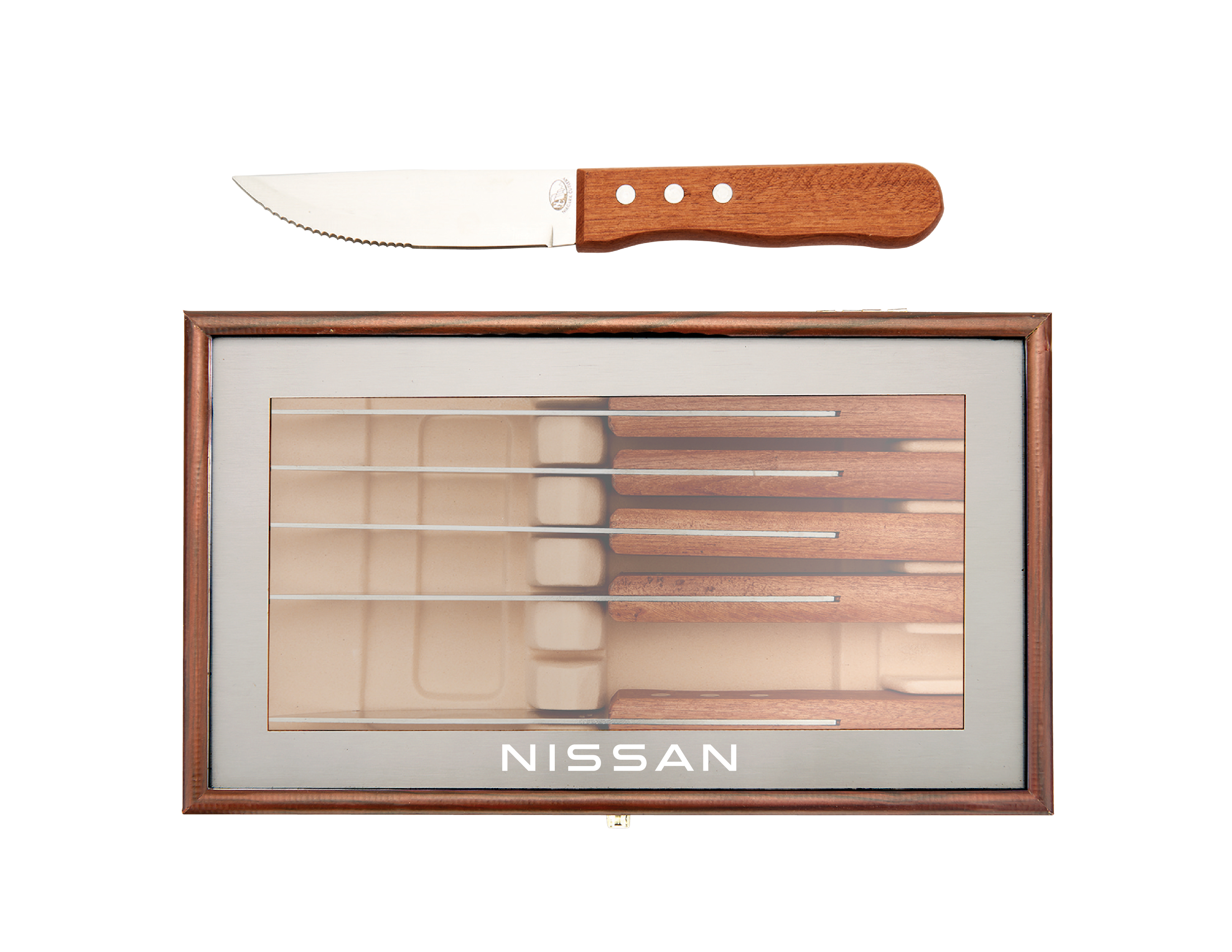- Set includes six steakhouse knives presented in wooden storage box with a glass presentation window